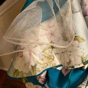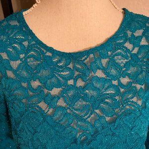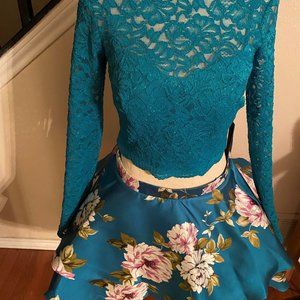 Turquoise/Ivy Long Sleeve Lace Top with Floral Print Skirt Two-Piece Dress