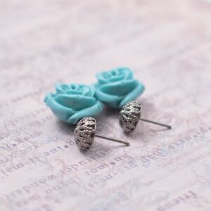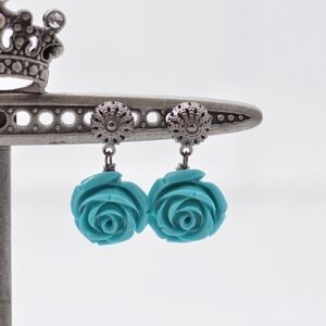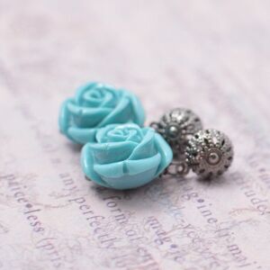 These adorable earrings are made with acrylic turquoise rose beads, which have been wrapped on antiqued silver head pins, and hung from antiqued silver filigree earring posts.