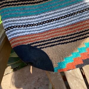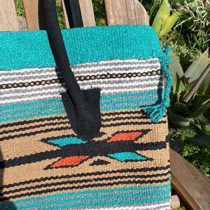 Southwestern style ladies tote purse. Handwoven classic Southwest designs in vibrant, rich colors. Carry your essentials in style! These versatile bags provide room for all your needs and accessorize your ensembles. Durable suede handles and corner accents. Large inner pocket with zipper, cloth lining, and a magnetic snap closure for top of bag.