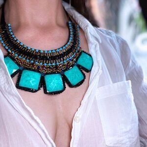 The chunky baubles, reminiscent of glistening water droplets, create a statement piece that demands attention. Each turquoise hue is carefully selected, reflecting the calming and refreshing essence of water. This statement bib necklace isn't just an accessory; it's an embodiment of your confident and sophisticated style.