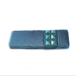 Stunning and fabulous glamorous turquoise blue metal mesh evening bag by Whiting & Davis, it is adorned with 6 large Swarovski turquoise crystal elements. The bag is amazing and unique. It is a clutch but has a silver mesh handle that can be tucked inside, magnetic clasps, inside pocket, tag still attached , metal logo inside and the black lining also has the script logo, never used, a great bag.