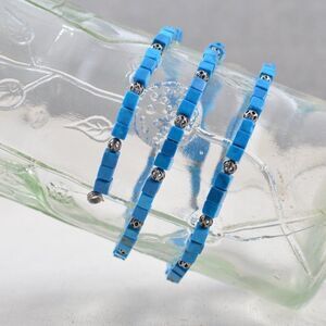 Beautiful square turquoise beads alternate with antiqued silver round filigree beads on this memory wire bracelet.