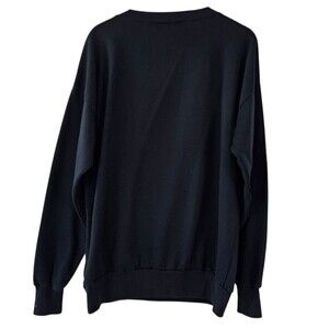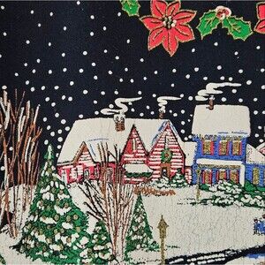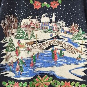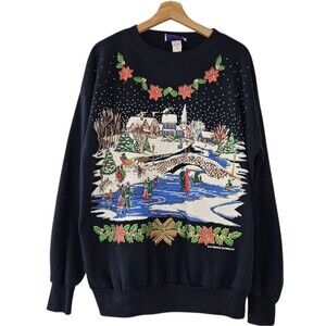 This vintage womens size large black pullover sweater is decorated with a snowy town scene. Textured graphic. Glitter paint accents. 100% acrylic.