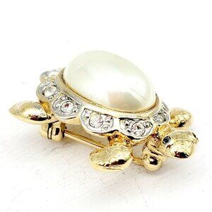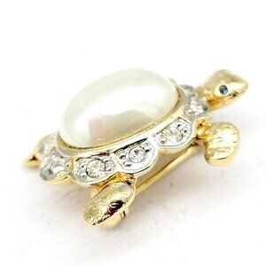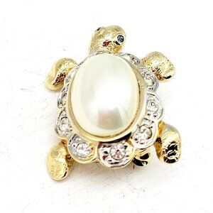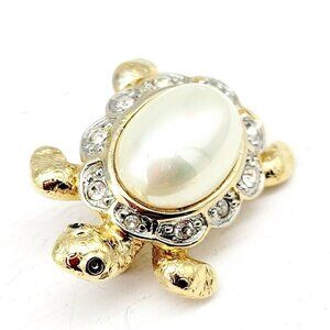 Turtle Brooch Rhinestones & Faux Pearl Gold Tone 1" Reptiles Animal Lovers