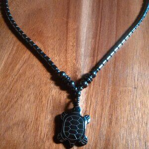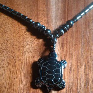 This hematite necklace features a turtle shaped charm and beaded hematite design. The necklace is a metal alloy clasp that is fastened and unfastened with a twisting motion. Brand new.