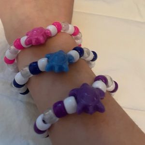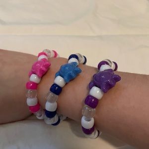 ✨3 piece set of turtle kandi bracelets✨3 singlets in colors pink blue and purple ✨handmade✨perfect for raves, scene kids ,pride, other occasions/outfits ✨only sold in set together due to Poshmark fees but please feel free to send a reasonable offer :)✨