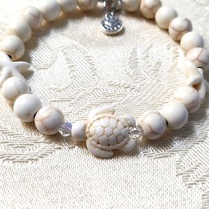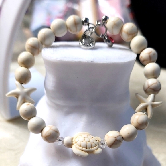 This elegant bracelet features cream-colored; Glass beads arranged in a classic circular strand. The Center is a Turtle of the same color & design as the Starfish! You have a silver Heart & Pink Crystal Charm Dangle. It is an Open end. Great Gift!