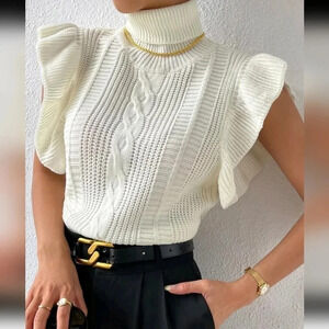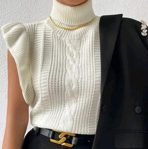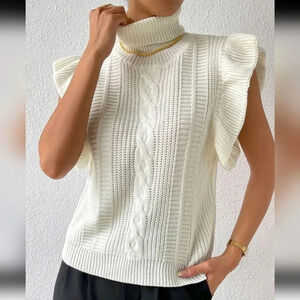 Turtle Neck Ruffle Trim Cable Knit Sweater Vest