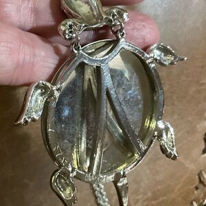 Silver toned metal turtle pendant necklace. Large turtle with textured head and legs. The neck is articulated. Body is mirror finish. Very hard to photo due to the mirror finish. Spring ring clasp. Retro vibe.