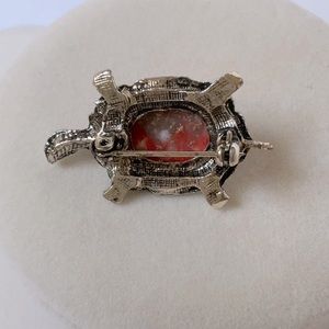 Silvertone turtle pin with a marled brownish and rosy pink stone inset. Good used condition.
