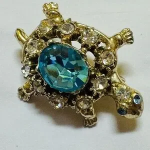 Turtle rhinestone brooch. Featuring a blue center rhinestone with blue rhinestone eyes. This accented with 10 clear rhinestones on the shell of the turtle and 1 rhinestone on the neck. It is set in gold tone. No missing stones. It is 1.5” x 1”.