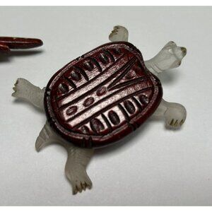 These vintage brooches features a charming turtle and swordfish design, expertly carved from wood and lucite, perfect for collectors or as a unique accessory.