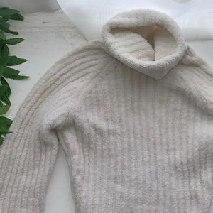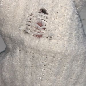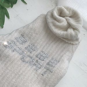 Plush cashmere turtleneck with rubbed fabric. Embellished with swarovski crystals. Slight damage at neckline that will be covered with the turtleneck overlay. (Stretch fit)