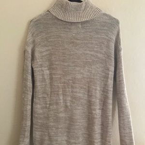 Beige long sleeve turtle neck sweater, cable knit detailing in front, loose fit, covers bum