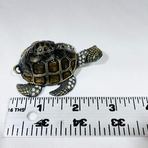 Introducing a Turtle with Baby Turtle Shaped Ceramic Hinged Trinket Box. This porcelain box, adorned with crystals, measures 2" x 3". A charming and functional decorative piece for storage or display.