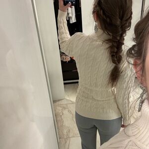 Cream turtleneck. Rayon nylon. 18” across bust and 27.5” long. Preloved with light wear reflected in discounted price.