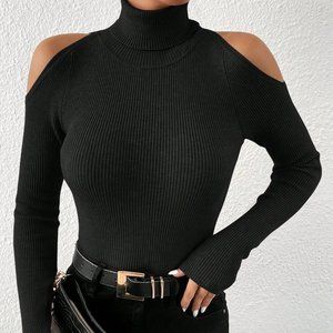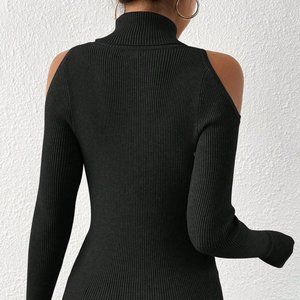 Turtleneck Cold Shoulder Ribbed Knit Sweater Black