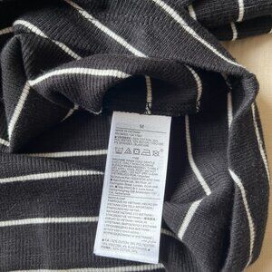 Soft feel, black turtleneck sweater with white horizontal stripes, form fitting versus a loose fit; 52% cotton, 29% polyester, 15% rayon, 4% spandex.