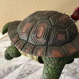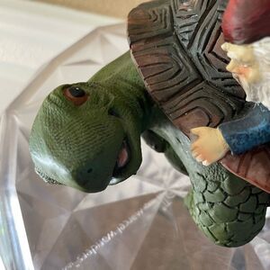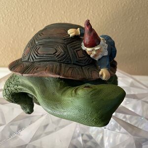 So cute! Hard plastic. Gnome riding on a turtle. Good size, 8x5. Colors are vibrant! Excellent shape.