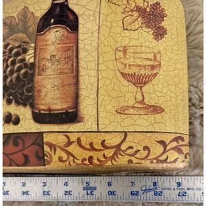 • Front design includes grapes, wine bottle, and goblet illustrations