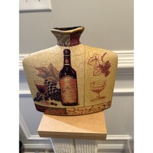 Tuscan Style Wine Bottle & Grapes Vase 10” x 9” Crackle Glaze Ceramic Decor