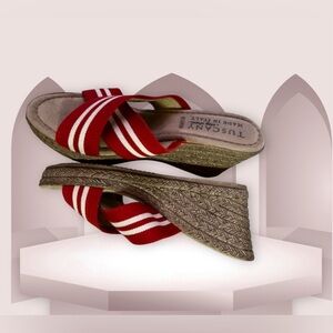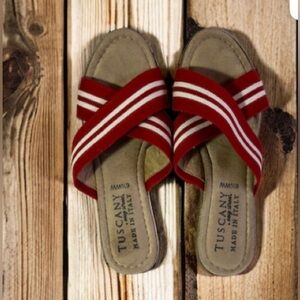 Tuscany By Easy Street Women’s Size 6.5 WW Red Striped Fabric Wedge Sandals Tuscany by Easy Street MALONE ESPADRILLE WEDGE Sandals are a pre-owned pair of shoes made in Italy. They feature a blue and white striped textile/synthetic upper material with layered accents and a slip-on closure. The wedge heel is cork and measures between 1 3/4 to 2 3/4 inches. The outsole is also made of cork. These sandals are lightweight, breathable, and perfect for summer, fall, and spring. They are suitable for travel, activewear, party/cocktail, casual, and business occasions. The shoe size is 6.5 WW.