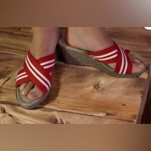 Tuscany By Easy Street Women’s Size 6.5 WW Red Striped Fabric Wedge Sandals