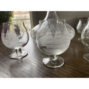 Tuscany Etched Clipper Ship Decanter/top & 6 Snifters Romania Hand Blown Barware