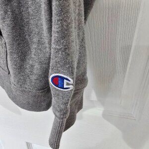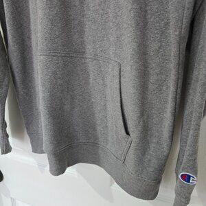 Excellent condition men's Champion brand Tusculum Pioneers 1/4 zip pullover sweatshirt with front kangaroo pocket and stand up collar. Fabric is polyester blend and color is gray. Size is large.