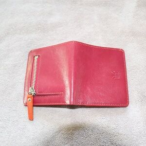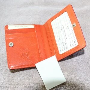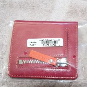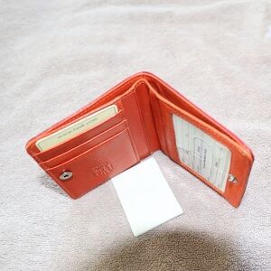 Tusk Snap Evening Leather Wallet. Fuchsia pink exterior with orange interior; and, green lining for bills. Leather wallet with stitching along entire exterior. Clear pocket for identification; three (3) credit card slots; and two additional pockets. Zippered coin compartment on exterior backside with leather tab pull. Never used and still in wrapping from when purchased. Great for pocket, small purse, travel, etc.