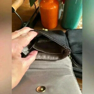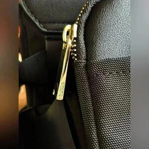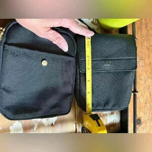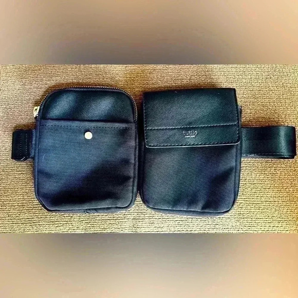 Tutilo New York crossbody adjustable belt bag, black, gold accents, roomy, two bags on adjustable strap, one zips, one snaps, see pictures for measurements, still have Silica Gel packs