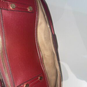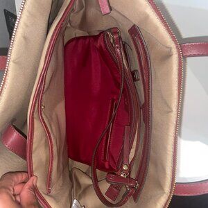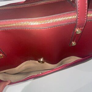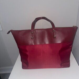 Stylish red tote bag with zipper closure and other compartments.