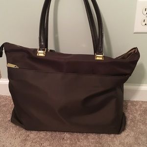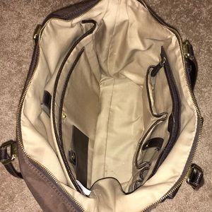 This Tutilo Studio Top Zip in brown is the perfect work bag with a multitude of interior and exterior compartments! There is a very small stain on the interior of the bag, but in good condition otherwise! It easily fits a laptop, tablet, 2" binder and more at the same time! Please let me know if you have any questions!