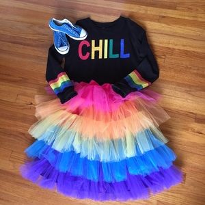 Rainbow 🌈 Tutu. Very full, long & fluffy. Sized as child’s OSO, elastic stretches to 28 waist. Measures 24 inches in length. Easily a small/medium in women’s. Good used condition.