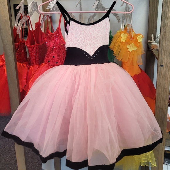 pink tutu with lace detail on bodice and oversized bow on back. Intermediate Child. between size small and medium