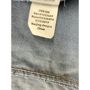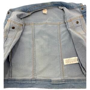 Classic light wash jean jacket with brass button snap front and chest pockets.