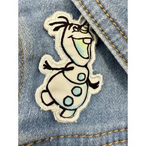 Features embroidered and appliqué characters Elsa and Olaf with a pastel snowflake patch and pink embroidered "Elsa" signature.
