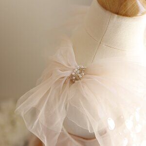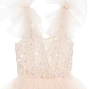 This Tutu Du Monde Dress does not disappoint!! the dress is done in "Vanilla", a beautiful pale neutral Apricot Blush. The dress features a crossover bodice studded with hand-sewn shimmering squined disc with pearl accents. The fun, floaty tulle shoulders gather at the center with matching pearl and sequin embellishments. The cascading tulle layered skirt is wispy and elegant! Perfect for Daddy/Daughter dances, recitals, Portraits, weddings and more! Would make a GORGEOUS, Unique Flower Girl Dress! New With Tags!