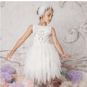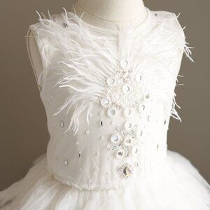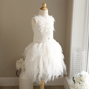 Celebrate in style with this Tutu Du Monde tulle dress! This enchanting dress is perfect for adding a touch of Sassy Elegance. The tank-style bodice, made from soft cotton, sparkles with a dainty mix of crystals and sequins, while delicate ostrich feathers lend a glamorous flair. Its feathered tulle skirt adds another layer of luxury to this elegant design, perfect for adding a sprinkle of flair to any celebration! Perfect for Flower Girls, Parties, Portraits, Dady Daughter Dances or other special occasions. New With Tags!