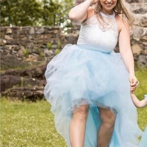 Two piece. White body suit on top big blue high low tutu skirt on the bottom