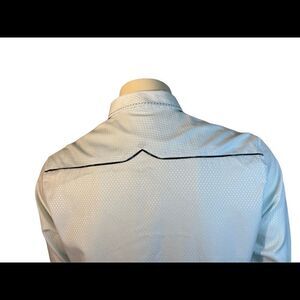 This stylish dress shirt is made by Tuvia, is mint green with navy stitching and trim and mint mother of pearl buttons, and is in like new condition. It’s 52% cotton and 48% polyester and an XL, which measures: