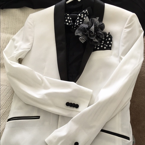 Get Prom ready with this brand new Classic white/black European fit tuxedo suit. Includes dinner jacket, black pants, shirt plus tie. Shirt size S, Trouser size 77, jacket size 92...remember it's European fit.
