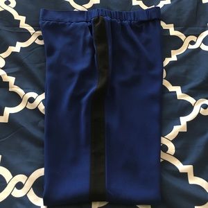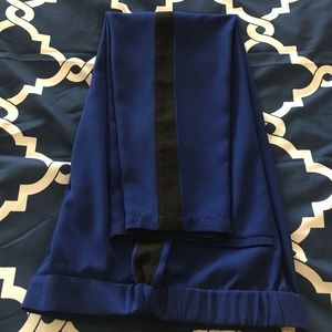 Normal wear and tear. No rips or stains. Blue with black stripe on side. One back pocket and two side pockets.