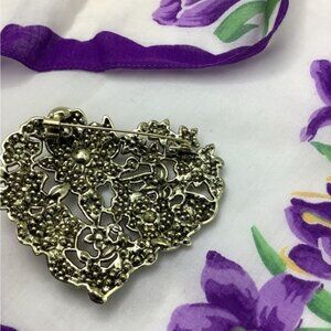 This exquisite floral heart brooch features vibrant crystals in a stunning array of colors, perfect for adding a touch of elegance to any outfit. The intricate design showcases a beautiful blend of pink, blue, green, and gold tones, making it a versatile accessory for any occasion. In mint condition , this brooch is 3” by 2 and 1/2” in size.