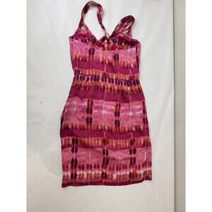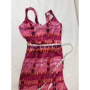 This gorgeous twee Banana Republic 100% silk dress in a pink tie-dye print, featuring a twisted shoulder and open back design will make you the life of the party. It is a sheath style dress with a knee-length hem, perfect for various occasions such as weddings, parties, casual outings, formal events, workwear, and business meetings. The dress is sleeveless, making it a versatile and stylish option for women looking for a chic and elegant outfit. And check out the bilateral pockets!