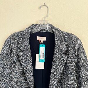 Textured ¾ sleeve blazer lined in blue rayon. Colors are dark blue, sky blue, white with a thread of silver sparkle. Perfect for the office. Professional yet soft and comfy.