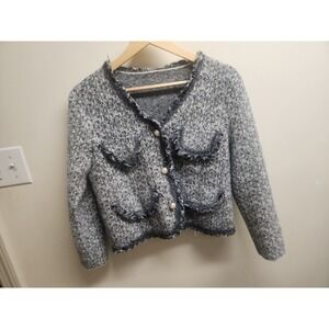 Tweed Cardigan Sweater Womens Fringe Trim Pearl Buttons Gray Small