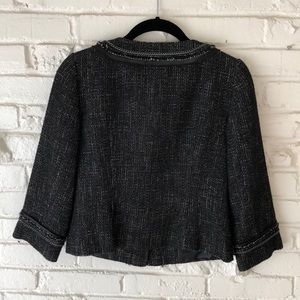 Black Chanel-esqe tweed jacket with 3/4 sleeves from Halogen (Nordstrom) - size XS. Beautiful details with silver chain, fringe, and satin around neckline, pockets, sleeves, etc. Can be paired with skirt in separate listing. Looks like Chanel - a great statement jacket for a fraction of the price! Excellent condition!