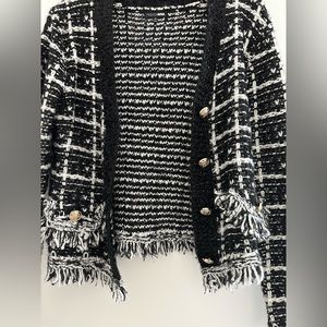 Fashion Nova tweed blazer runs true to size . Limited stretch. Gold detail , pocket detail . Sweater can button up . Fast shipping discounted price