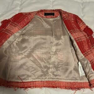 Red tweed jacket with ruffles + plaid like pattern
